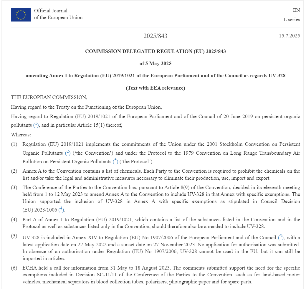 欧盟持久性有机污染物(POPs)法规体系再迎新修订。2025715日,欧盟官方公报发布(EU) 2025/843号法规,针对UV-328实施渐进式管控措施,新规自公布后第20日起正式生效。