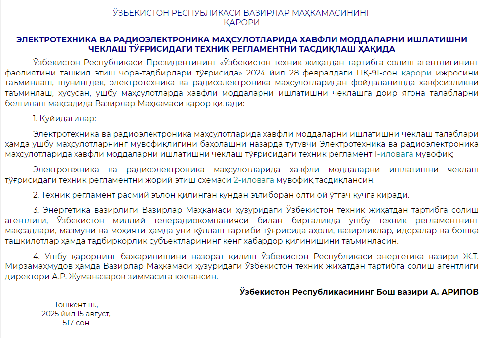 乌兹别克斯坦共和国内阁批准了《关于限制在电气和电子产品中使用有害物质的技术条例》(2025年第517号决议),以限制电气和无线电电子产品中有害物质的使用,该条例将于2026年2月15日生效。所有涵盖的电气和无线电电子产品在投放市场前,必须进行强制性的合格评定,符合这些要求的产品必须加贴合格标志。