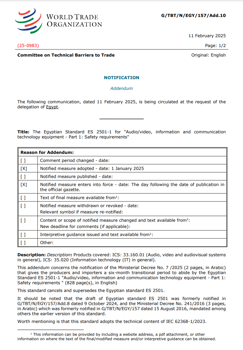埃及工业部于2025211日通过WTO通报(G/TBT/N/EGY/157/Add.10)正式发布了视音频和信息通信技术设备安全标准ES 2501-1:2024,该标准全面采用国际电工委员会(IECIEC 62368-1:2023的技术内容,并取代了此前的埃及标准ES 2501。产品需标注符合性声明(CoC)、技术参数、测试报告等,确保透明化和可追溯性。这一举措旨在提升埃及市场相关产品的安全性,涵盖音频/视频设备(ICS 33.160.01)和信息技术产品(ICS 35.020)两大领域。