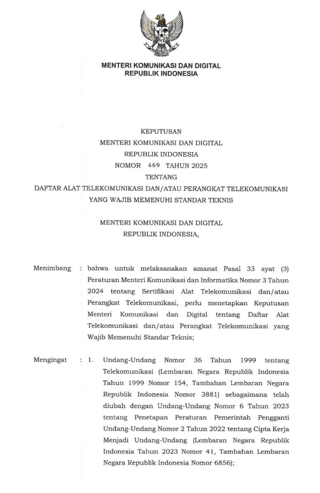 2025年11月,印度尼西亚通信与数字部(Ministry of Communication and Digital Affairs)正式发布《2025年第469号法规》(Keputusan Menteri Komunikasi dan Digital Nomor 469 Tahun 2025),明确要求所有具备电信或无线射频功能的设备必须通过印尼DJID(Directorate General of Information and Communication Technology Development)强制认证。该法规已于2025年12月7日正式生效。
